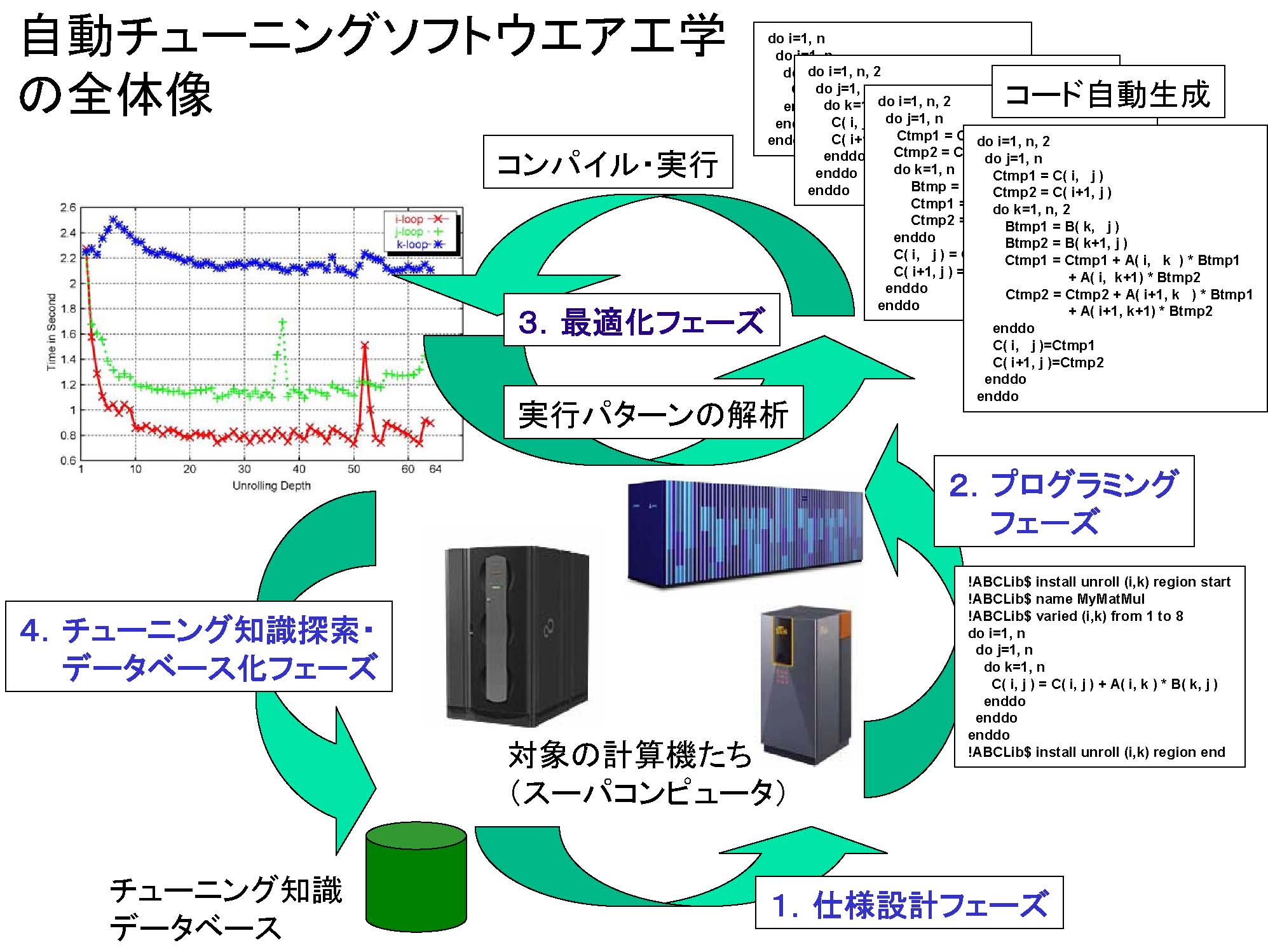 この自動チューニングソフトウエア工学におけるソフトウエア開発サイクルにおいて、高性能を達成するソフトウエアを、(1)いかに効率良く、かつ(2)どのような計算機環境においても高性能である(性能可搬性を保証する)ように構築するか、という学問体系が「自動チューニングソフトウエア工学」なのである。