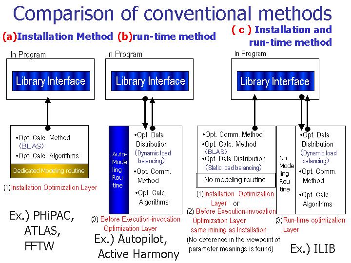Fig.5 shows that the methods of conventional libraries are categorizes as three methods. They are (a) Installation method, (b) Run-time Method, and (3)Installation and run-time method. From Fig.5, we can find that there is no method, except for FIBER method, to have three kinds of parameter optimization layers, and to refer optimized parameters from the higher layers in the three kinds of optimization layers.