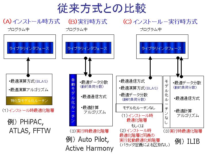 図5から分かるように、従来のライブラリにおける自動チューニング方式は、(A)インストール時方式、(B)実行時方式、(C)インストール-実行時方式、のみありました。FIBER方式のように、3階層の最適化を有し、かつ、3階層の最適パラメタ参照を有する方式はありません。