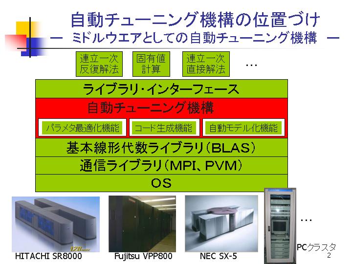 ここで機能(1)については、ここでは詳しく言及しませんが、ある言語機能により自動チューニング機能を付加するコード開発を支援する機能である、とだけ述べておきます。以降、機能(2)について説明をします。