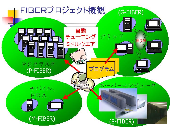 FIBERプロジェクトとは、ある一種類の言語で開発されたプログラム、すなわちライブラリやプログラムの一部分、について、性能を劣化させることなく、以下の環境に自動的に移植できる機能をもつ、システムソフトウエア(ミドルウエア)を開発するプロジェクトです(図1参照)。