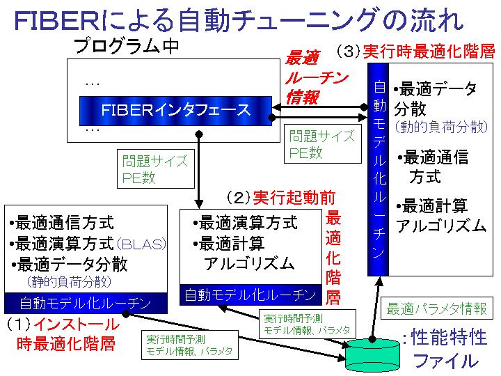 FIBERプロジェクトとは、自動チューニング機構に関するソフトウエア開発(基盤ソフトウエア開発)のための統合プロジェクトです。